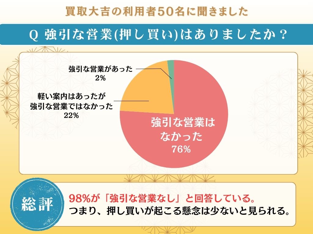 事実、買取大吉を利用した方に実施したアンケートでは、利用者の98%が強引な営業や押し買いを受けなかったと回答。