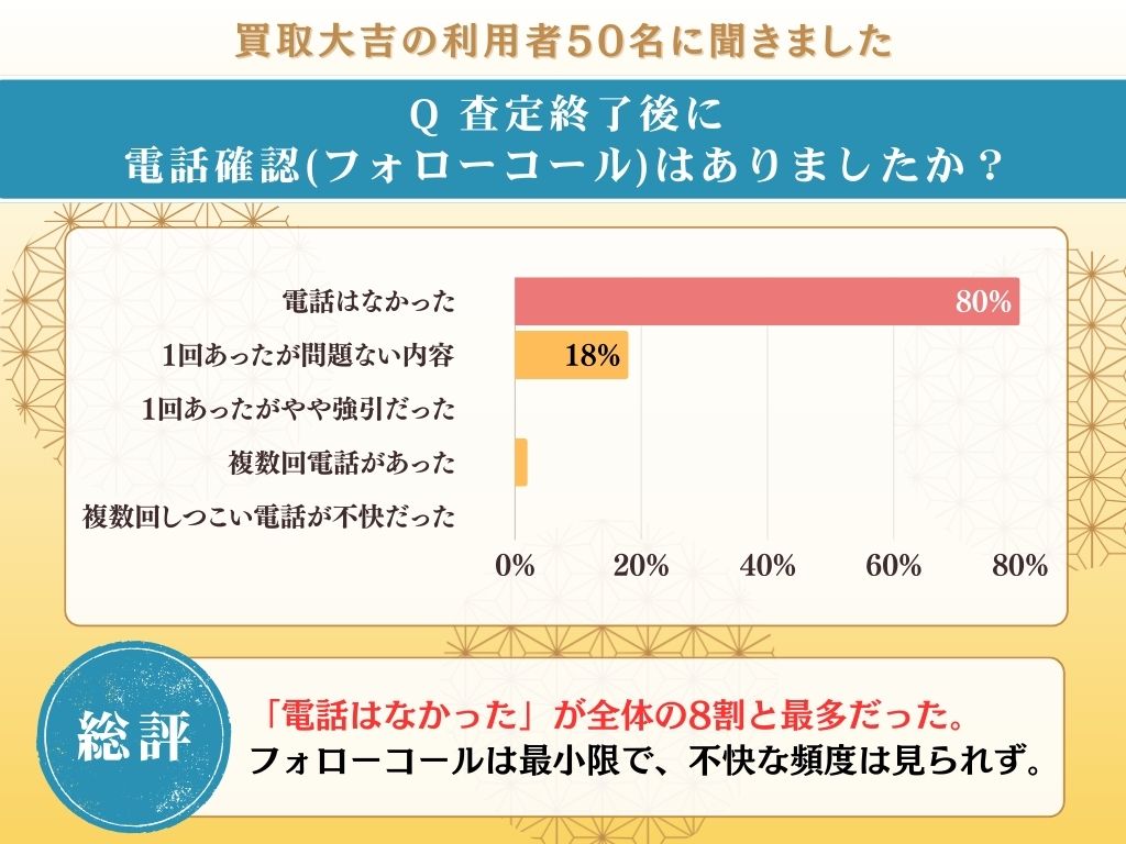 また、査定後もしつこい営業電話はほぼ行っておらず、「電話はなかった」が80%、「1回だけ電話があったが、問題なかったが」が18%という結果。