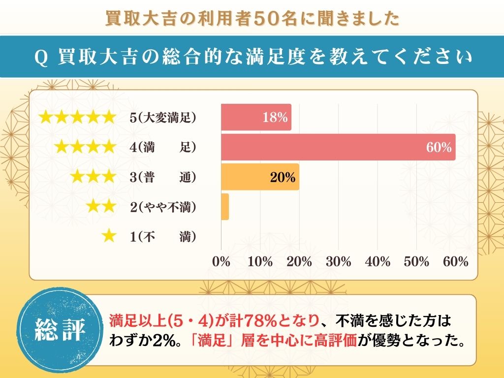 事実、独自アンケートでは78%が「大変満足」または「満足」と回答している点からも、安心感を持って取引でき、納得のいく形で着物を売却できる体制が整っているとわかります。