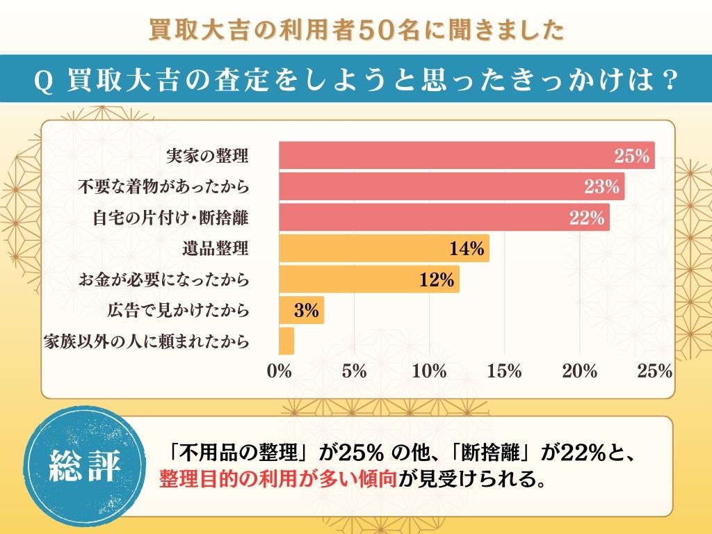 なお、買取大吉で査定を依頼しようと思ったきっかけとして最も多かったのは、「実家の整理」が25%、「不要な着物があったから」が23%でした。