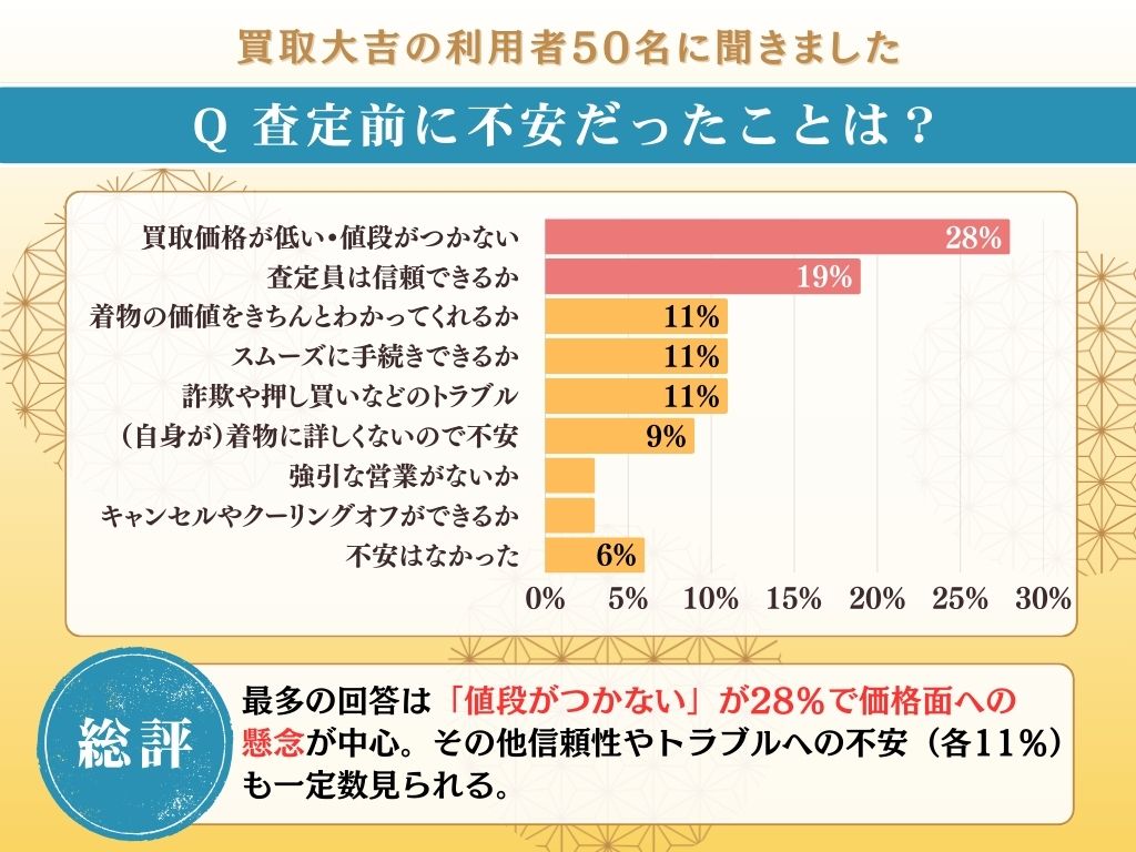 そのためか、実際に利用した方の28%が「買取価格が低い(買い叩き)・値段がつかない」、19%が「査定員は信頼できるか」を不安視していた様子。
