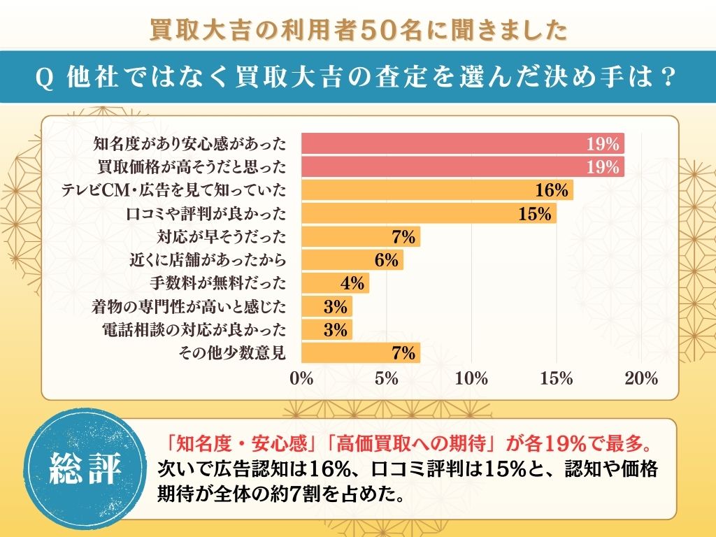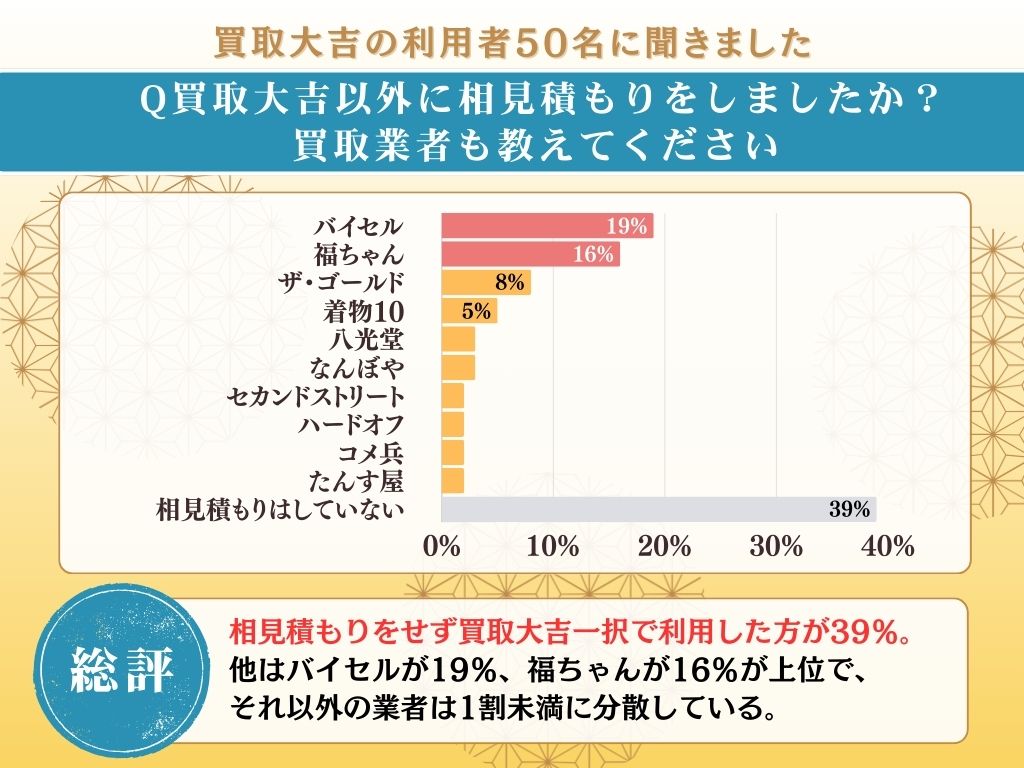なお、買取大吉の他に相見積もりした買取業者は「バイセル」が19%、「福ちゃん」が16%と、いずれも着物買取に実績がある業者が並びます。