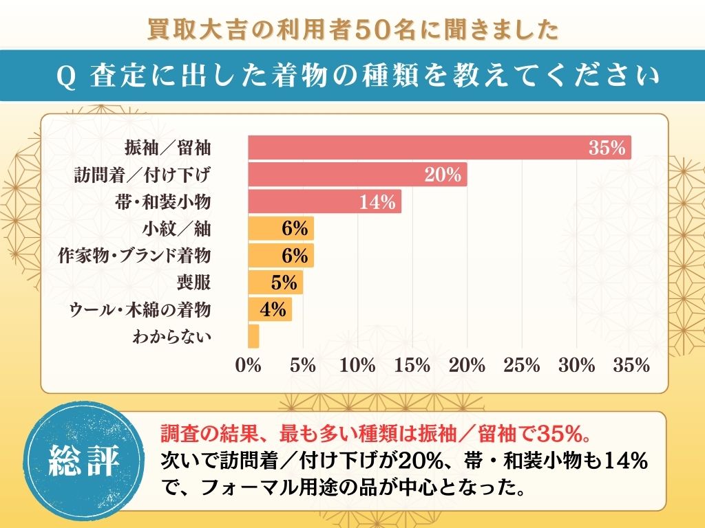 実際に買取大吉で着物を査定に出した方へのアンケートでは、「振袖・留袖」が35%と最も多い結果となりました。