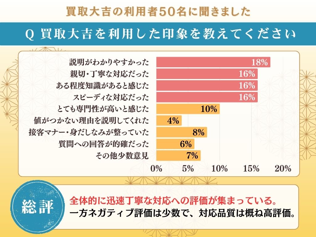 アンケートでは、査定の根拠・説明に関する声が目立っており、査定や接客の問題というよりも、売り手目線での説明を求める意見といえるでしょう。