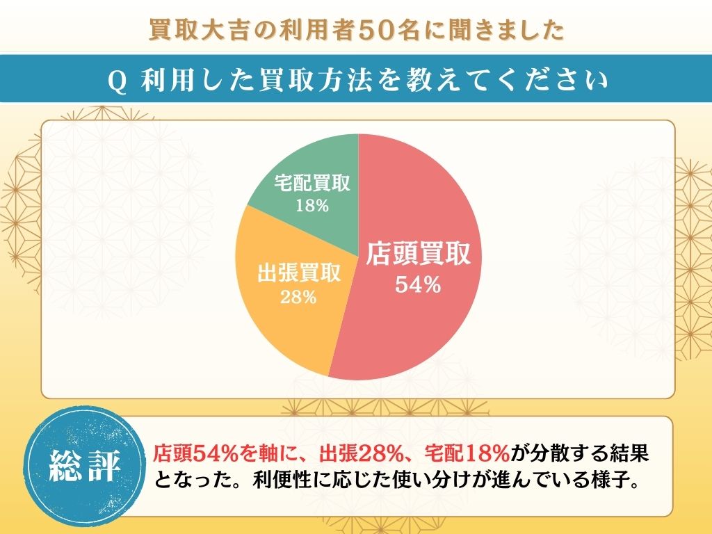 そのため一般的な買取サービスでは「出張買取」の方がシェアが高い傾向があるなか、買取大吉では約半数が店頭買取を利用しています。
