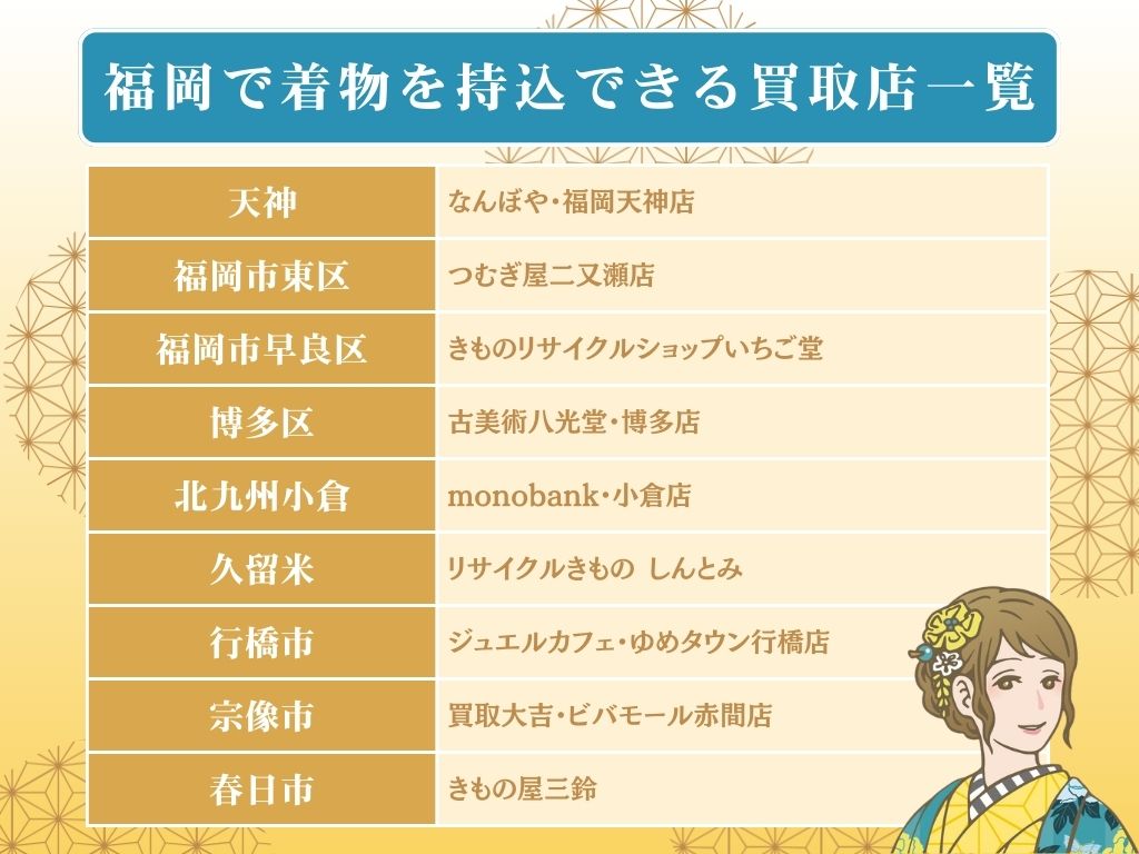 ここでは、福岡県内の着物買取で、着物の持ち込みが可能な店舗を9店舗ご紹介します。