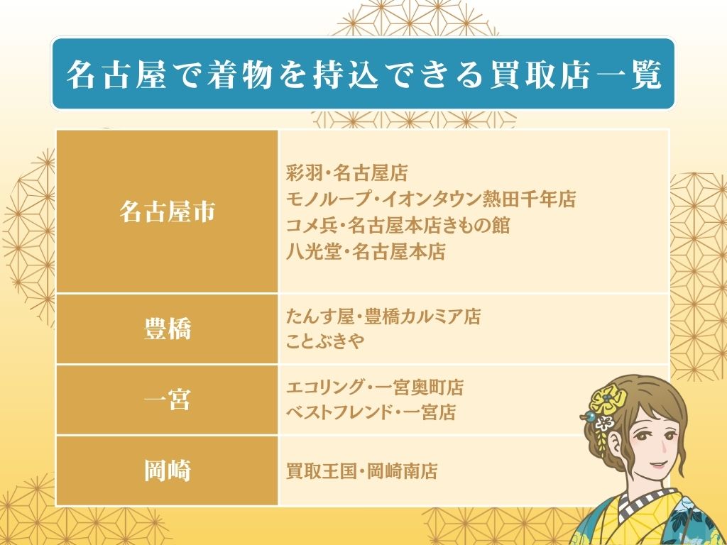 着物買取で、店舗に持ち込みができる愛知のお店(名古屋市・豊橋市・一宮市・岡崎市)のおすすめは以下の通りです。