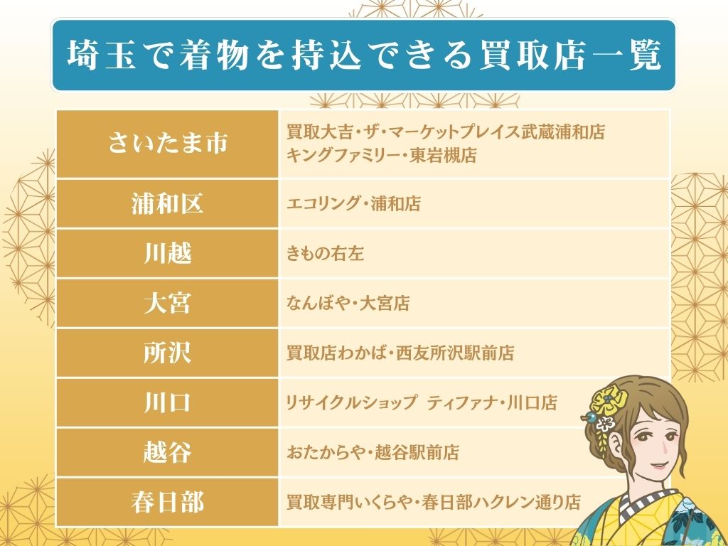 この記事では、埼玉で持ち込み買取ができるおすすめの着物買取店をエリア別にご紹介します。