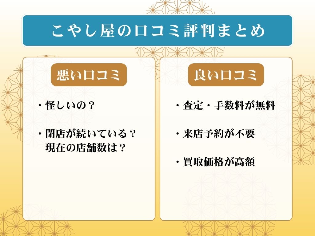 そこでここでは、こやし屋に悪い口コミは本当にあるのかについて解説し、またこやし屋に買取を依頼するメリットについても実際の口コミをふまえてご紹介します。