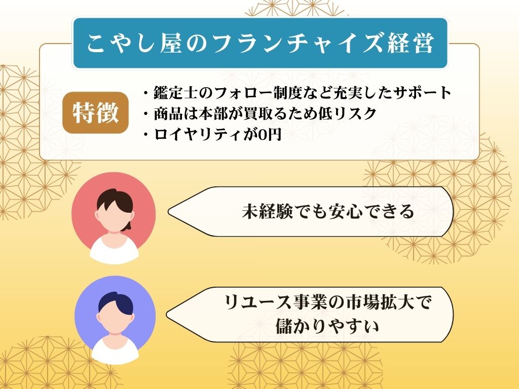 他にも、ロイヤリティ0円や鑑定士のフォロー制度なども整っているため、比較的少ない自己資金で店舗経営をおこなうことが可能でしょう。